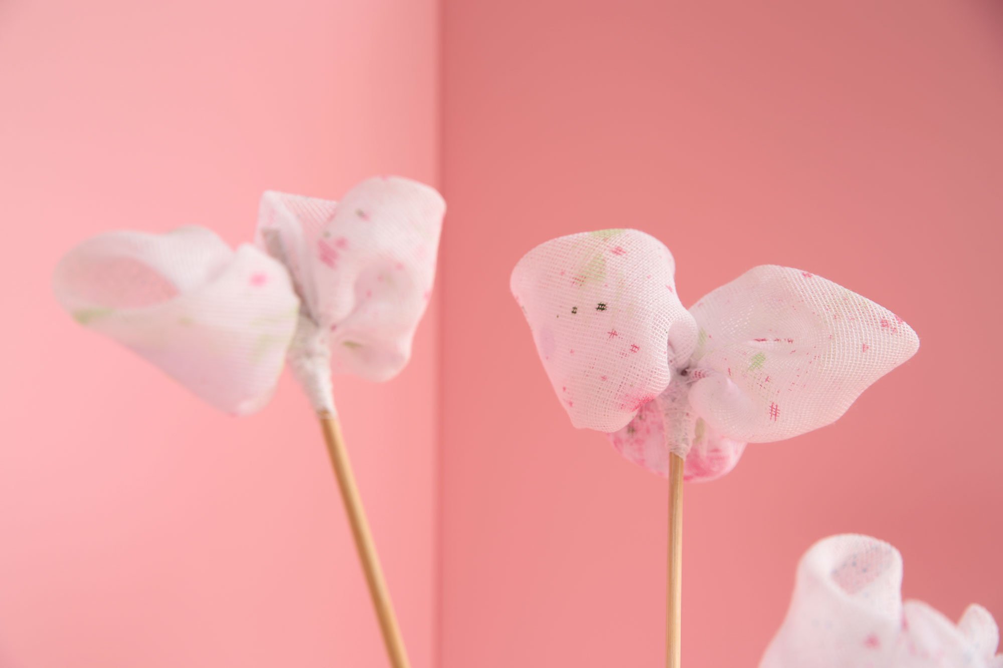 // Hand painted cotton cheesecloth, wood stick. Glass flowerpot. *Pink base not included.